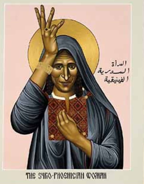 - Robert Lentz, icône, 21e siècle, site trinitystores.com, États-Unis. Ce franciscain, originaire du Colorado, a reçu une formation dans la tradition iconographique byzantine. Cherchant à renouveler cet art, il a écrit plusieurs icônes de saints et saintes et de figures contemporaines, qui sont très connues et utilisées. La Cananéenne (Syro-phénicienne), vive et résolue, main levée, avec sa bague et son bracelet, nous regarde.