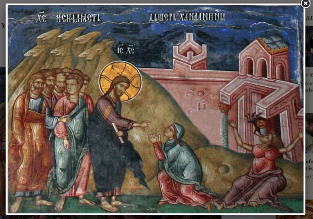 - Icone orthodoxe, site orthochristian.com. Dans cette icône de la tradition grecque orthodoxe, on voit à gauche les disciples, Pierre et Jean en tête; au centre, Jésus répond à la Cananéenne, inclinée devant lui; les deux se regardent. Jésus tient en main un rouleau des Écritures. Élément plus original : à droite, la libération de la fille tourmentée, un démon sortant d’elle. À l’arrière, un rocher et des éléments architecturaux.