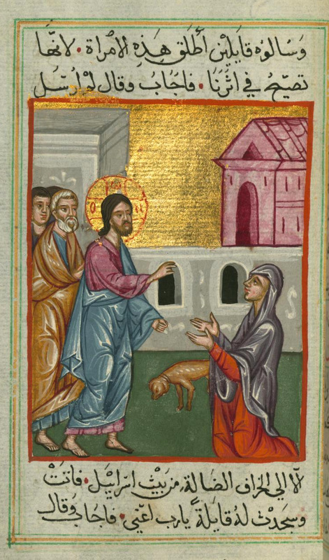 - Ilyas Basim Khuri Bazzi Rahib, miniature, 1684, Manuscrit W592, Walters Art Museum, Baltimore, États-Unis. Les miniatures de ce manuscrit des Évangiles, en arabe, ont été réalisées par un moine copte en Égypte. La Cananéenne est agenouillée mais bien droite, les mains tendues; un chien est à son côté. Jésus s’adresse à elle; Pierre et Jean sont derrière lui. À l’arrière-plan, des éléments architecturaux sont présents.