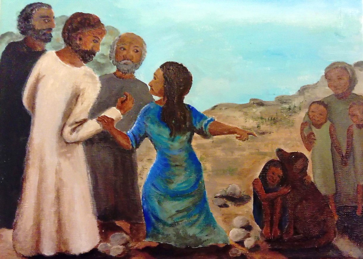 - Ally Barrett, 2017, site reverendally.org, Angleterre. Cette artiste britannique est prêtre de l’Église anglicane. Elle a été pasteure en paroisse et est maintenant aumônière d’un collège universitaire. Elle a publié plusieurs livres sur des questions pastorales. Ici, la Cananéenne, petite mais déterminée, touche Jésus pour qu’il écoute et saisisse sa demande. Un chien est présent, auquel s’accroche l’enfant. Des disciples sont proches de Jésus, dont deux plus visibles. À droite, la grand-mère prend soin des autres enfants, pour que la mère puisse faire sa demande à Jésus. Les pierres suggèrent ce qui peut faire tomber les petits (Mt 18,6). Le bleu de la robe évoque intentionnellement Marie, à Cana (Jn 2, 1-11) : « Marie, sa mère, lui a montré que son heure était venue et que le moment était venu pour lui d’accomplir son premier signe ».