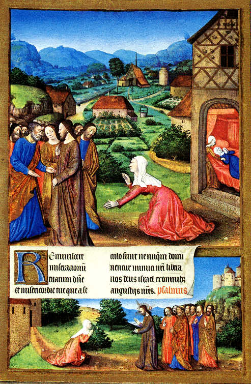 - Jean Colombe, miniature, 1485-1486, Les Très Riches Heures du Duc de Berry, Musée Condé, Chantilly, France. Plusieurs artistes ont contribué aux miniatures de ce manuscrit, commencé en 1410. Colombe a achevé l’œuvre, qui comprend 66 grandes miniatures et 65 petites. Le style est le gothique international. Les couleurs sont vives, le bleu très présent. Les paysages s’inspirent de lieux et édifices de France. La Cananéenne est une des 12 grandes miniatures de la partie sur Les heures de l’Année liturgique. En haut, la femme est agenouillée devant Jésus, qui est tourné vers Pierre et Jean. Élément plus rare, la fille souffrante est montrée dans la maison à droite. En bas, la Cananéenne est à nouveau agenouillée et implorante; Jésus et les disciples sont maintenant tournés vers elle.