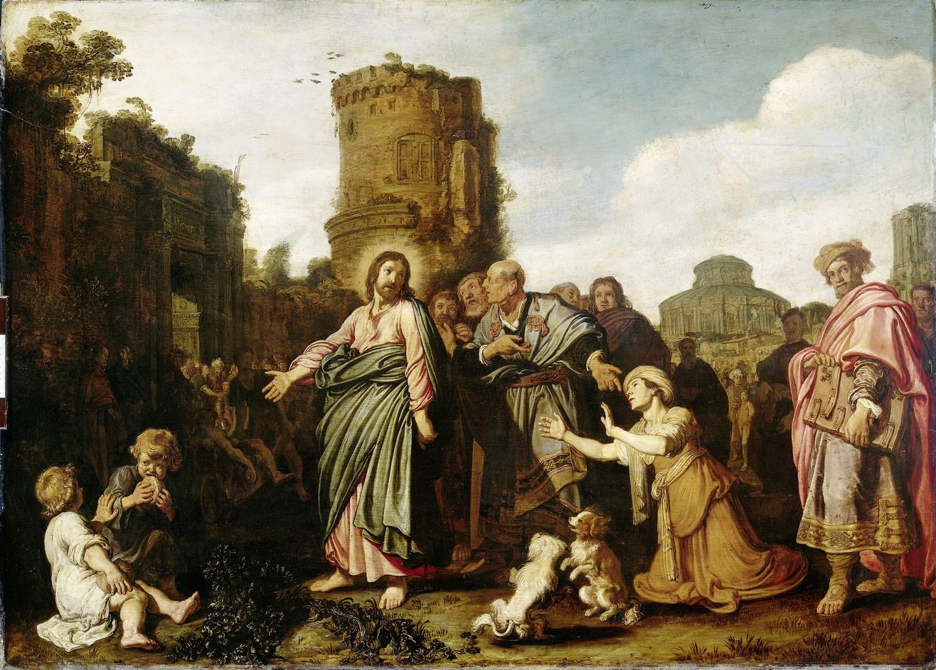 - Pieter Lastman, 1617, Rijksmuseum, Amsterdam, Pays-Bas. Ce peintre néerlandais a séjourné en Italie et fut influencé par Le Caravage et Carraci. Il a développé un style dramatique et vivant, qui fut très apprécié aux Pays-Bas. Il a eu Rembrandt comme élève. La Cananéenne supplie Jésus; des petits chiens, charmants, sont près d’elle. Jésus montre des enfants mangeant du pain dans le coin gauche. Ainsi, les enfants, le pain et les petits chiens du texte sont présents. Pierre, avec Jean à droite, demande au Christ d’intervenir. D’autres scènes se passent aux portes de la ville. L’architecture antique est bien développée. À droite, debout et nous regardant, l’artiste lui-même!