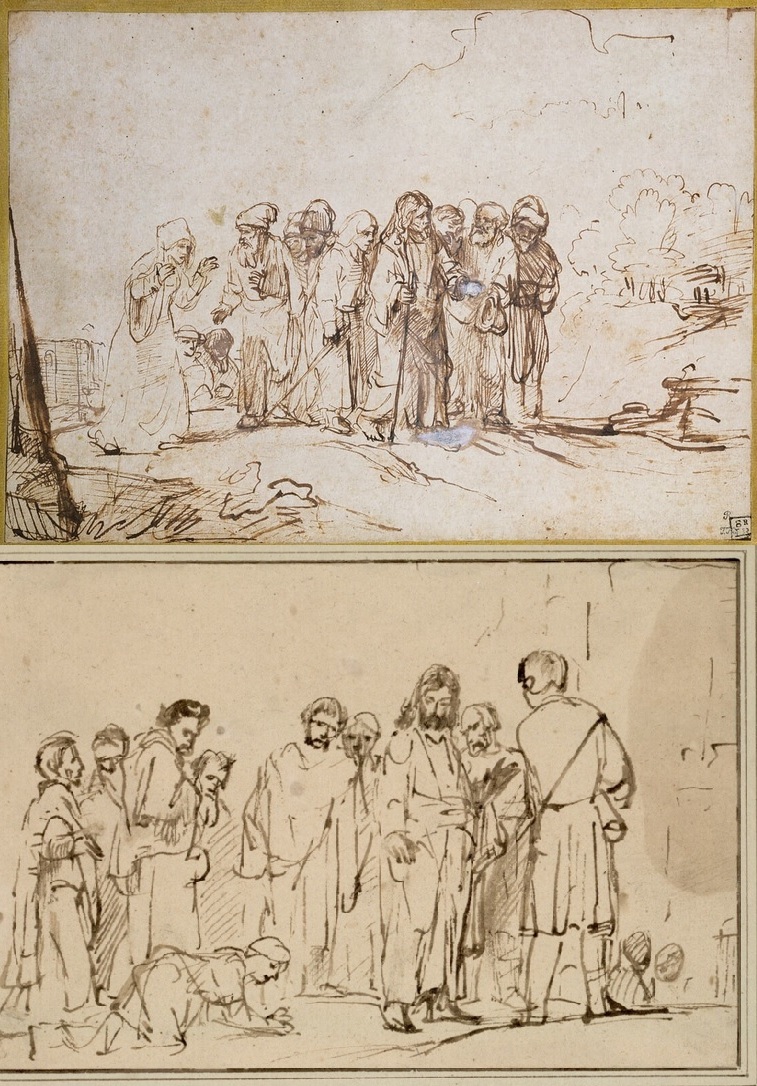 - Rembrandt van Rijn, dessin, c.1650, Collection privée, Angleterre; dessin, c.1660, Albertina Museum, Vienne, Autriche. Durant cette décennie, la situation familiale et financière de Rembrandt fut difficile. Dans le premier dessin, la Cananéenne, debout à gauche, s’approche du groupe des disciples. Pierre réagit. Jésus ne la voit pas ou ne la regarde pas; Jean est à gauche de lui. Le décor est minimal. Dans le deuxième dessin, la Cananéenne est prosternée, elle implore Jésus. Celui-ci la regarde, ainsi que la plupart des disciples.