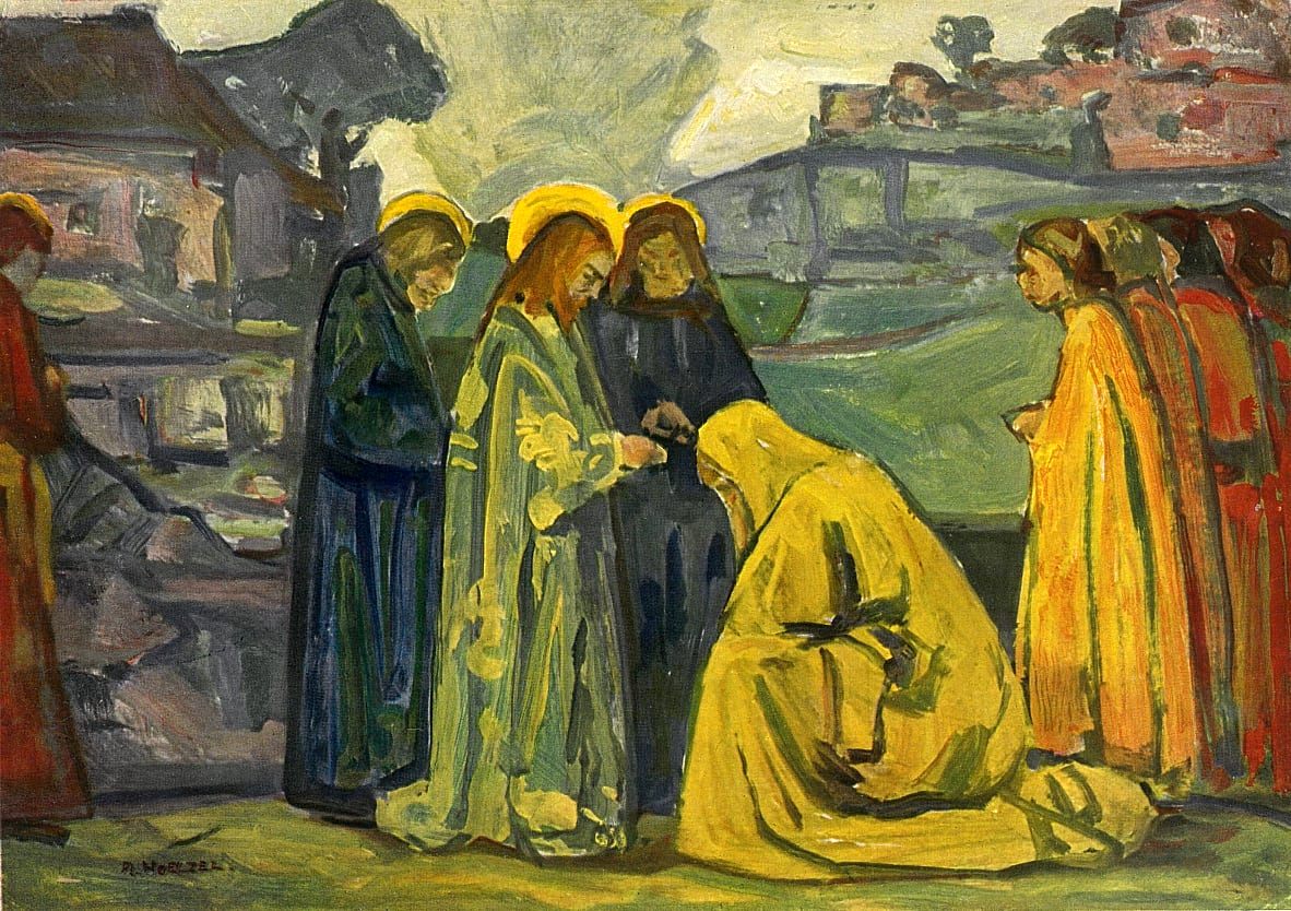 - Adolf Hölzel, 1926, Collection privée. Ce peintre allemand, qui est passé d’un art réaliste à une approche non-figurative, a fait des œuvres religieuses, à la frontière des deux courants. Ici, la Cananéenne est agenouillée devant Jésus; on voit peu son visage. À droite, un groupe de personnes semble l’accompagner. Jésus, avec deux disciples, est tourné vers elle. Le jeu entre les couleurs est travaillé.