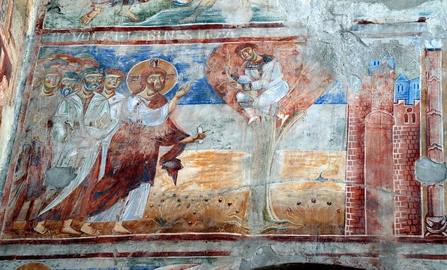 - Fresque, c.1080-1090, Basilique San Angelo in Formis, Capoue, Italie. Cette église est couverte de fresques de style italo-byzantin, présentant des scènes et figures de l’Ancien et du Nouveau Testament. Elle a été construite par l’Abbé Didier de l’Abbaye du Mont-Cassin. Les fresques ont été faites par des artistes grecs de Constantinople et leurs élèves italiens ; leur bleu est renommé. La ville de Jéricho est évoquée par les murs et tours. Jésus, nimbé, tenant en main un écrit, est accompagné de disciples. Il s’adresse à Zachée, bien mis et grimpé dans l’arbre.