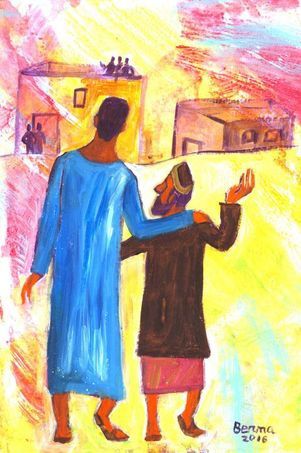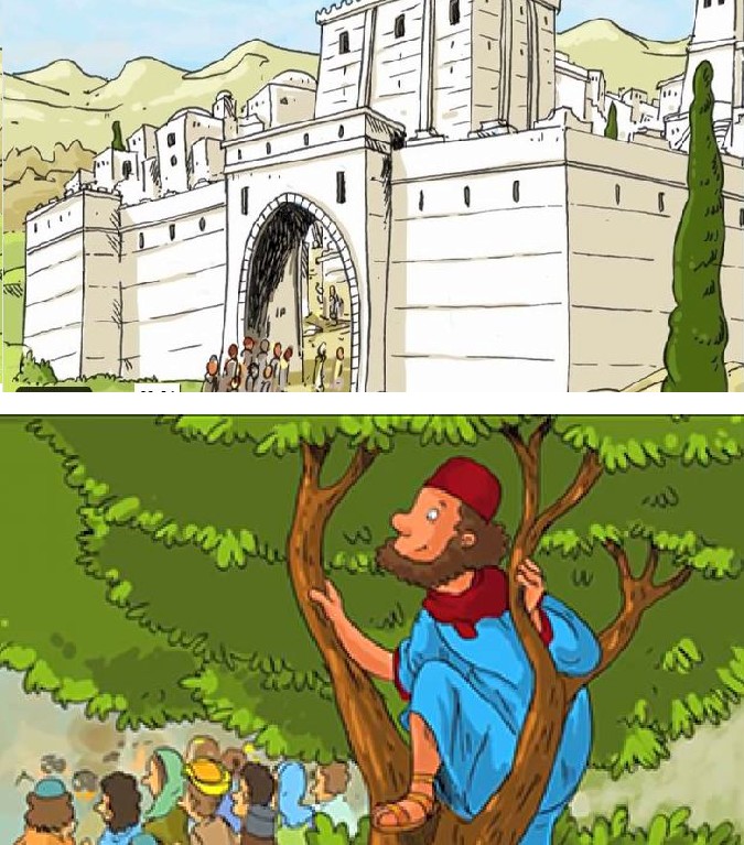 - Berna, 2016, site evangile-et-peinture.com, Suisse. Bernadette Lopez a couvert tout le cycle liturgique avec ses œuvres vives et inspirantes. Cette image est originale et sympathique: elle nous montre Jésus et Zachée à ce moment particulier entre la rencontre au sycomore et l’accueil dans la maison. Ils marchent ensemble dans une rue de Jéricho. Zachée est visiblement plus petit !