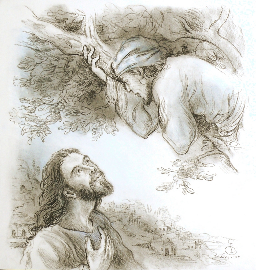 - Pierre Lussier, dessin, 2022, site racef.art, Canada. Cet artiste de Québec, membre du Réseau Art Chrétien et Éducation de la Foi (Racef), dessine des scènes et figures bibliques avec finesse et intériorité. Ici, nous avons Jésus et Zachée dont les regards se rencontrent. La main droite de chacun est mise en évidence. Jéricho est suggéré à l’arrière. Une rencontre advient, aujourd’hui …