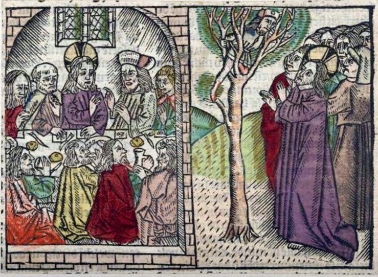 - Maître d’Antwerp, gravure sur bois, c.1485-1491, Rijksmuseum, Amsterdam, Pays-Bas. Ce peintre flamand est célèbre pour son tryptique sur l’adoration des mages. On sait peu de choses de lui. Cette œuvre lui est attribuée. Deux scènes sont montrées. À droite, la rencontre autour de l’arbre (qui est un peu élémentaire) : Jésus est avec des disciples et d’autres personnes; ses mains sont tournées vers Zachée aux courtes jambes. À gauche, Zachée accueille Jésus dans sa maison pour un repas festif. Des disciples sont présents et Jésus est au centre.