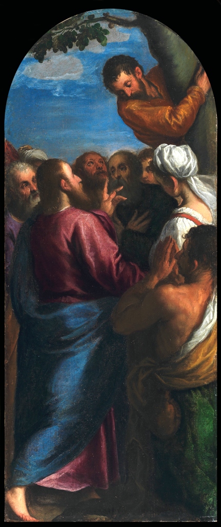 - Jacopo Palma le Jeune, 1575, Fitzwilliam Museum, Cambridge, Angleterre. Cet artiste de Venise a été marqué par Titien et Le Tintoret, auxquels il a succédé comme peintre majeur de Venise. Il a abordé une variété de sujets. Cette œuvre en est une de jeunesse. Les personnages (Jésus et Zachée, des disciples et diverses figures) sont concentrés dans un espace, proches les uns des autres. L’arbre est simplement évoqué. On y trouve un souci de la richesse et de l’harmonie des couleurs, avec la lumière et le mouvement.