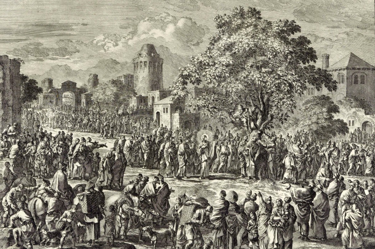 - Jan Luyken, gravure, 1708, Rijksmuseum, Amsterdam, Pays-Bas. Ce graveur néerlandais, proche des Mennonites, a illustré plusieurs livres, de la Bible à l’histoire et aux métiers. Il était aussi écrivain et il a publié des poèmes. Nous avons ici une vue d’ensemble très vivante : la ville de Jéricho, sa porte et ses édifices; toute une foule avec sa diversité et ses activités; Jésus, avec des disciples, s’adressant à Zachée juché; et un sycomore impressionnant.