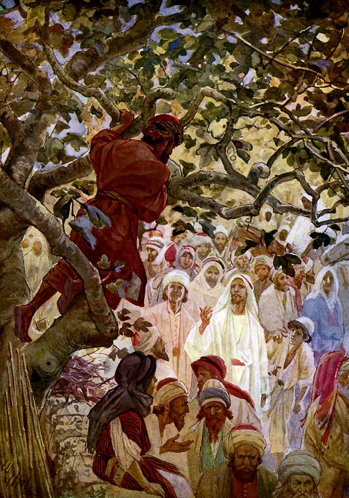 - James Tissot, c. 1886-1894, Brooklyn Museum, États-Unis. Ce peintre français a vécu en Terre Sainte et a mis en images les Évangiles avec une attention au contexte, au paysage et aux gens. La scène est vue de plus haut que Zachée, comme d’un balcon. On aperçoit Jésus, les disciples, la foule. Dans l’arbre, il y a aussi d’autres personnes que Zachée. Le sycomore est omniprésent et unifie le tout.