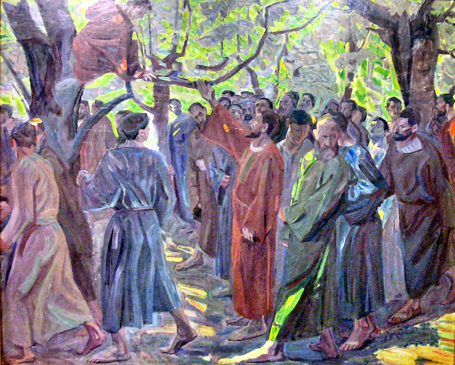 - Niels Larsen Stevns, 1913, Randers Museum of Art, Danemark. Ce peintre danois, de l’Église luthérienne, était un fervent croyant. Il a peint plusieurs scènes religieuses, dans un style moderne. Jésus, au centre en rouge, s’adresse à Zachée; les deux sont proches aussi par leurs couleurs. Plusieurs figures, aux visages concentrés à la Kierkegaard, sont en mouvement autour de cette rencontre. Les arbres et la lumière s’entremêlent. C’est un tableau très travaillé et intéressant. On a l’impression que la prochaine étape serait d’aller vers une approche cubiste.
