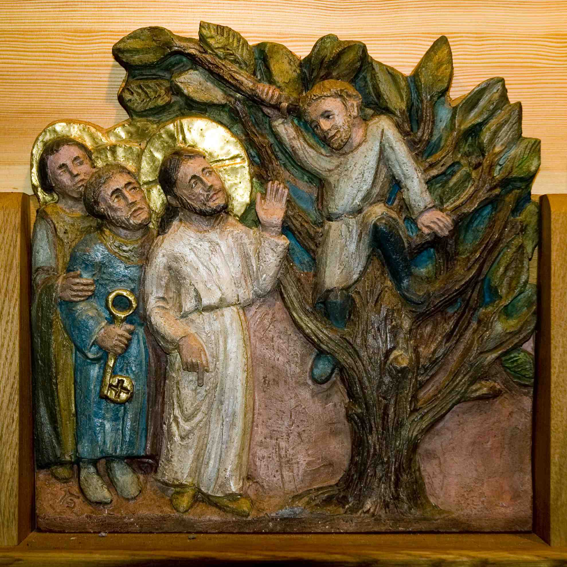 - Soeur Mercedes, bas-relief en céramique, 2006, oratoire, Abbaye Notre-Dame-des-Neiges, Saint-Laurent-les-Bains, France. Saint Charles de Foucauld est entré chez les Trappistes dans ce monastère en 1890, où il a vécu sept mois. Il est revenu à quelques reprises et y a célébré sa première messe en 1901. La chapelle d’adoration, contenant des reliques du saint, a été érigée en 2006, après sa béatification. Sr Mercedes, bénédictine, a réalisé une série de bas-reliefs sur la vie de Jésus et celle de Charles de Foucauld. Cette rencontre de Jésus et Zachée est très touchante : les regards communiquent. Le sycomore est solide. Jésus est accompagné de Pierre et Jean.