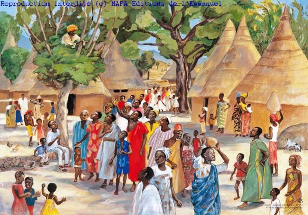 - JesusMafa, c.1975, Collectif pour la catéchèse, Cameroun. Pour favoriser une appropriation des Évangiles par les jeunes, la scène est inculturée en contexte africain, avec les paysages et les édifices, les figures et le mode de vie. Tout le peuple est là. On peut remarquer la présence de plusieurs enfants. Jésus, en rouge au centre, interpelle Zachée, qui a l’air bien installé dans l’arbre.