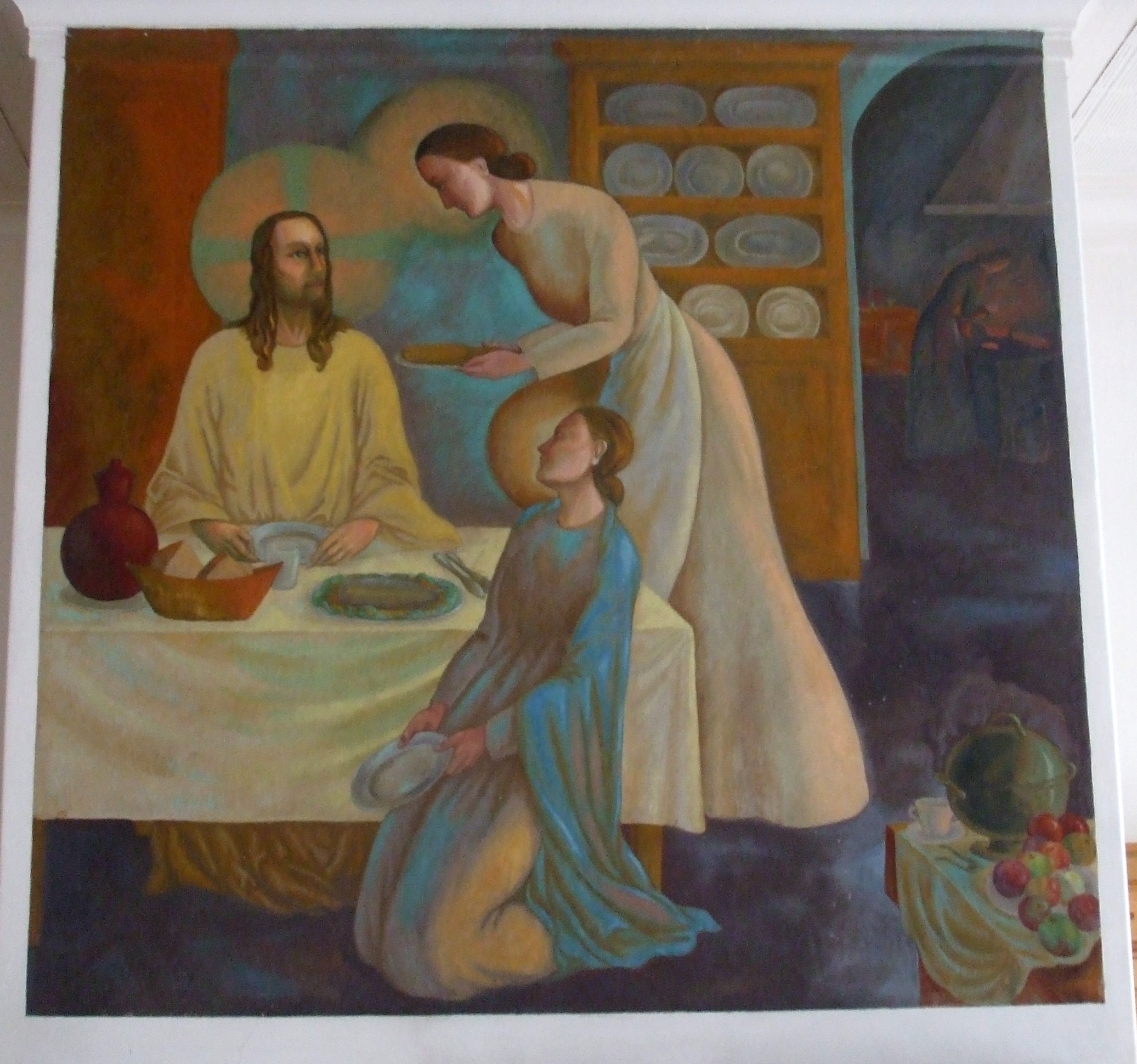 - André Lecoutey, fresque, c.1937, réfectoire, Couvent dominicain St-Jean-Baptiste, Ottawa, Canada. Ce prêtre français, formé aux Ateliers d’art sacré, a vécu au Canada de 1946 à 1953. Il fut impliqué dans le renouveau de l’art sacré au Québec, avec Le Retable, à Joliette, regroupant plusieurs artistes; et il fut cofondateur de la revue Arts et Pensée. Cette belle et grande fresque, réalisée lors de son premier séjour au Canada, nous montre les trois figures, nimbées, autour d’une table : Marthe debout et servant, Marie agenouillée, et Jésus assis; une autre personne est au travail à l’arrière. L’armoire française au mur ajoute une note locale. Mais l’originalité de cette œuvre est de nous présenter ce qui n’a jamais été montré : Jésus qui va manger du maïs! Il ne semble pas trop surpris. C’est une inculturation unique : nous avons enfin le Seigneur au blé d’Inde.