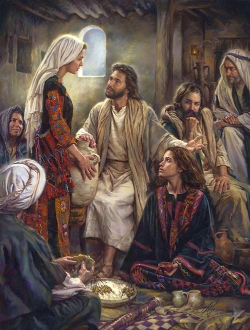 - Nathan Greene, 21ème siècle, site nathangreenestudio.com, États-Unis. Cet illustrateur originaire du Michigan, formé à Chicago, a travaillé pour plusieurs entreprises et maisons d’édition; il fut proche d’Harry Anderson, un artiste Adventiste réputé. Il fait maintenant des peintures de scènes bibliques, présentées en contexte contemporain ou de façon très vivante. Ses œuvres sont très utilisées dans les Églises nord-américaines. En celle-ci, le contexte de la rencontre est animé, avec des invités et un climat amical. Marthe et Jésus sont engagés dans un bon échange; la jeune Marie y porte attention. Dans l’espace restreint de cette demeure modeste, où tous les personnages sont rapprochés, la proximité de Jésus ressort. Comme s’il s’invitait chez nous …