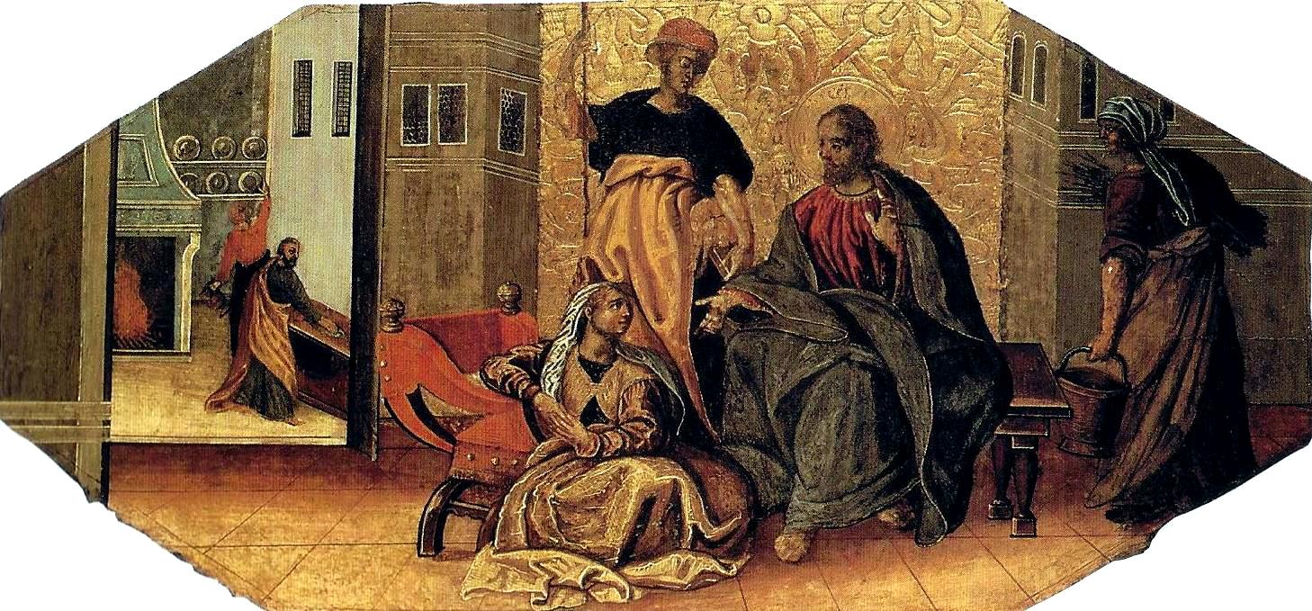- Ivan Rutkovych, icône, 1697-1699, Iconostase Nova Skvariava, Musée National de Lviv, Ukraine. Cet artiste ukrainien a fondé l’École iconographique de Zhovkva qui fut influente pour le renouveau de l’art de l’icône. Tout en s’inscrivant dans la tradition byzantine, il a intégré divers éléments de l’art européen contemporain, dont le baroque. Son iconostase pour l’Église de la Nativité-du-Christ à Zhovkva, maintenant au Musée de Lviv, est la plus estimée de l’Ukraine, un trésor national. Elle comprend sept rangées d’icônes. La rencontre de Jésus avec Marthe et Marie en fait partie. Jésus et Marie, tous deux assis, sont en conversation. Marthe, debout à droite avec son sceau, à l’écart, observe la scène. À gauche, des personnes sont au travail près d’un foyer. Qui est la figure debout au centre : un saint, un ange, un prince, Lazare?