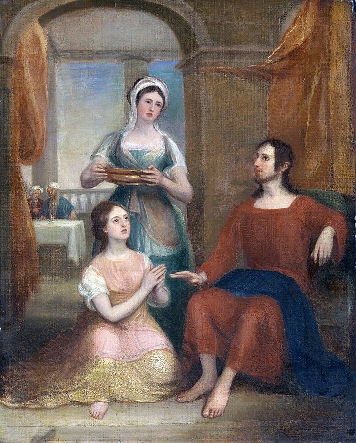 - Thomas Clement Thompson, 1847, National Gallery of Ireland, Dublin, Irlande. Ce peintre de Belfast a travaillé comme portraitiste, d’abord à Dublin où il a été formé, puis à Londres où il s’est installé à partir de 1817. Il est un des fondateurs de la Royal Hibernian Academy. Les positions de chaque figure sont claires : Marie à genoux, les mains jointes, Marthe debout tenant un plat, et Jésus assis. L’œuvre est un peu étrange : les trois ont un air figé et regardent dans le vide, comme si le mouvement s’arrêtait. Au fond, des gens sont à table, dans cette vaste maison avec boiseries, rideaux et balcon.
