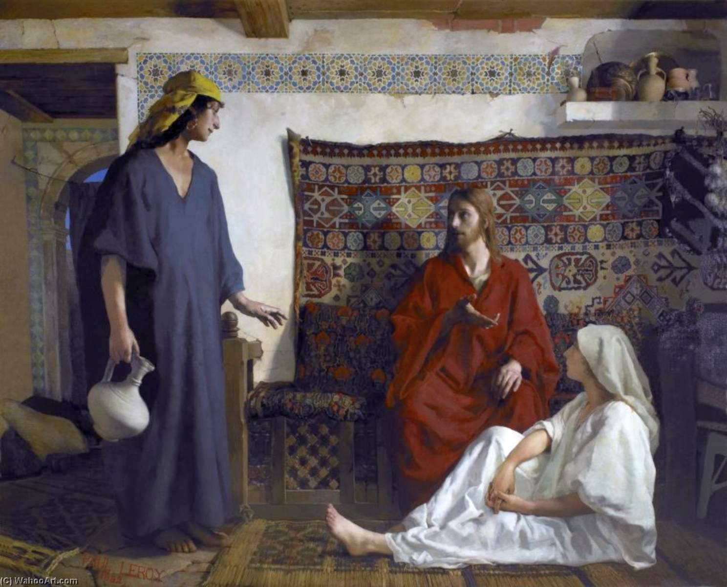 - Paul Leroy, 1882, Musée des Beaux-Arts, Rouen, France. Cet artiste a vécu la première partie de sa vie à Odessa, aujourd’hui en Ukraine mais alors en Russie. En 1877, à 17 ans, il arrive à Paris où il poursuit sa formation de peintre. Il a beaucoup voyagé en Afrique du Nord (Algérie, Égypte, Tunisie) et en Turquie; il a appris l’arabe. En 1893, il fut l’un des fondateurs de la Société des Peintres Orientalistes Français. Il est réputé pour son dessin et son sens des couleurs. Ici, c’est une œuvre de jeunesse, mais impressionnante et travaillée dans le détail. Marthe et Jésus conversent à propos de Marie. Les couleurs des vêtements des trois figures sont contrastées.
