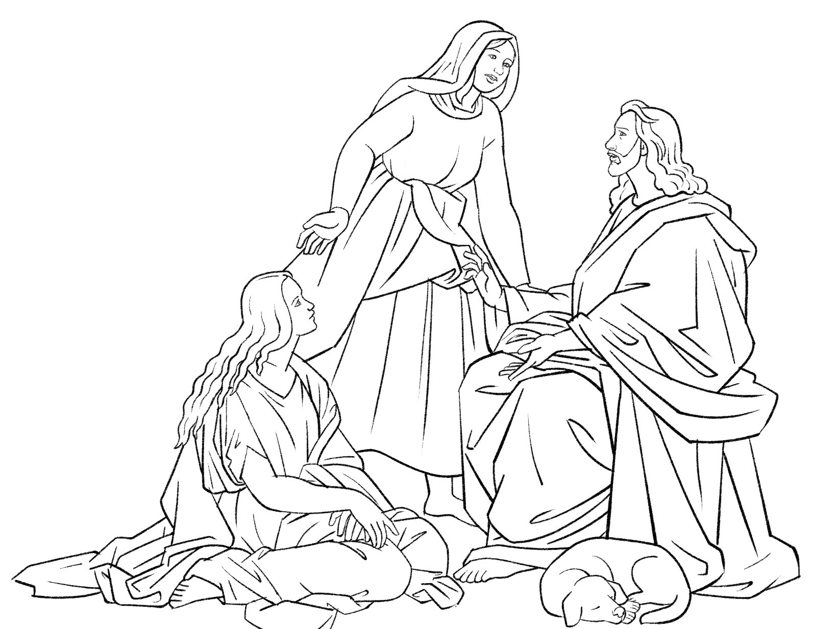 Près de Jésus, on trouve les deux figures de Marthe et Marie, et souvent aussi des invités et des disciples. Marthe et Marie sont bien identifiables par leur posture physique : Marie assise ou agenouillée aux pieds de Jésus et Marthe debout, en activité. Marie a habituellement l’air plus jeune que Marthe. Jésus est plus fréquemment en conversation avec Marthe, à propos de Marie, comme dans le texte. Parfois, Jésus et Marie sont en dialogue et Marthe est un peu à distance.