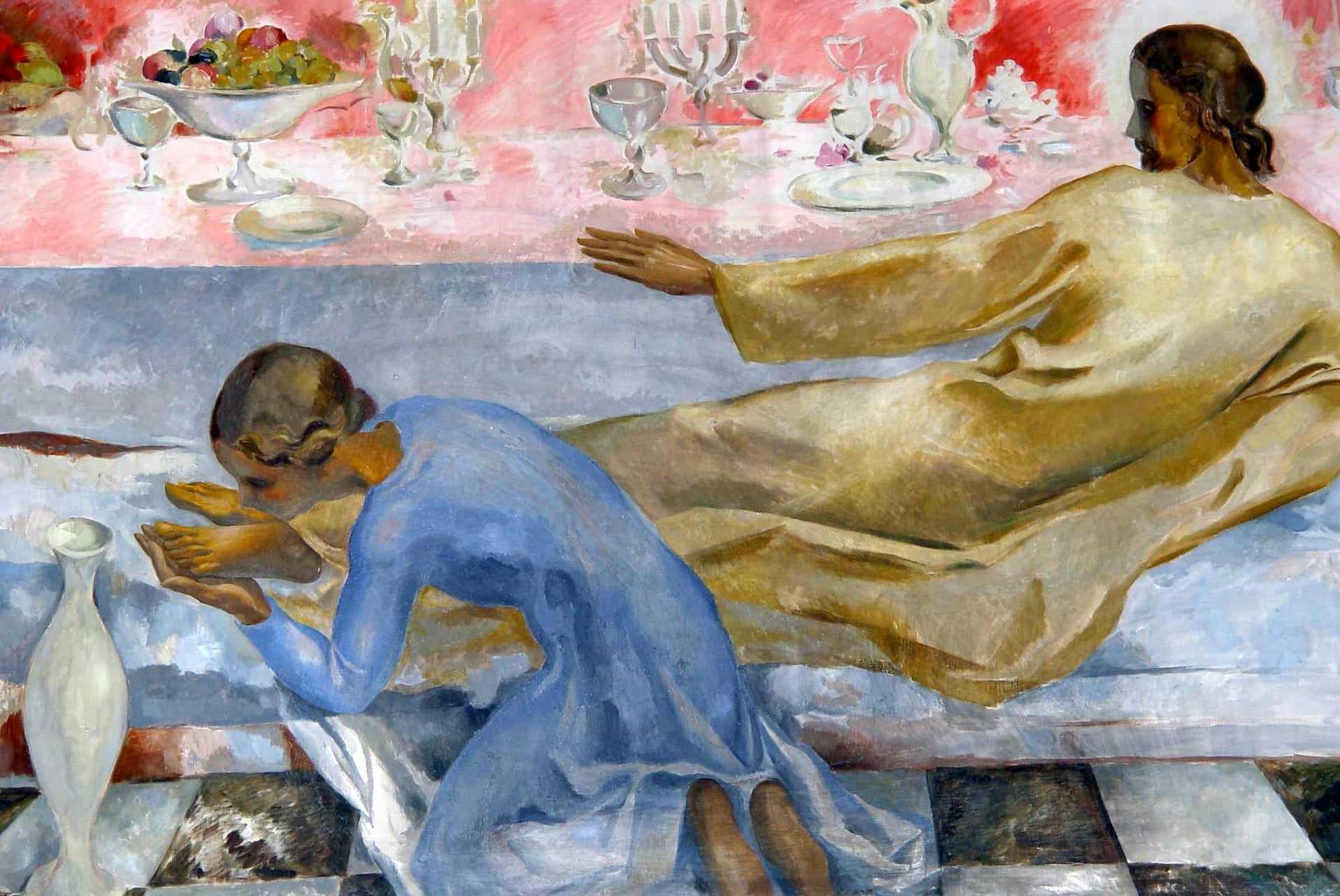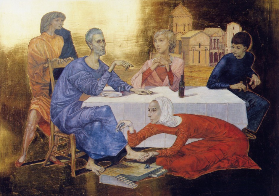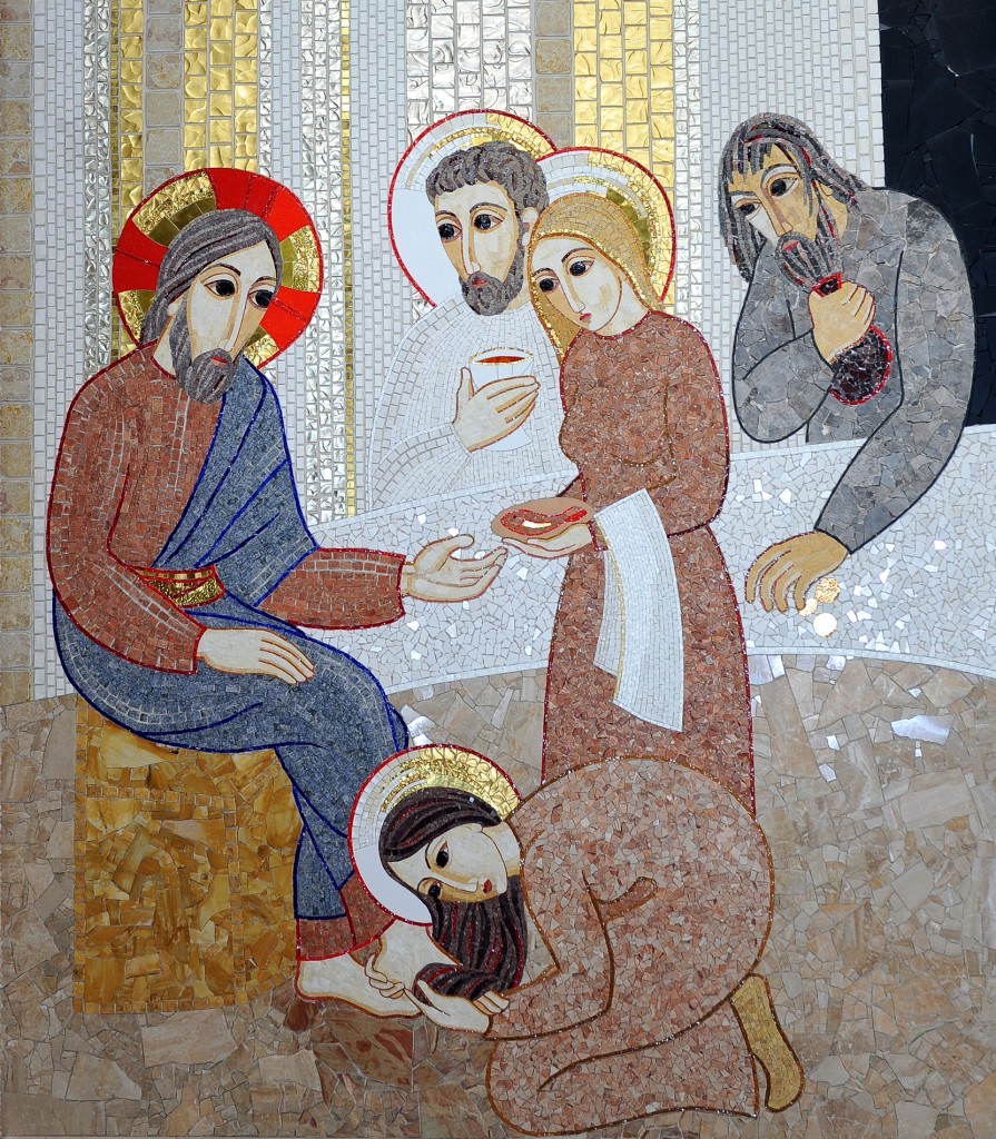 - Marie-Alain Couturier, c.1937-1938, réfectoire, Couvent Santa Sabina, Rome, Italie. Ce dominicain français, formé aux Ateliers d’Art sacré, a joué un rôle majeur dans le renouveau de l’art chrétien au 20e siècle. Durant les années 40, il séjourna au Québec et eut une influence pour ouvrir les peintres aux nouveaux courants. Ici, il n’y a que Jésus et une femme, possiblement Marie de Béthanie. C’est une œuvre de grande dimension et impressionnante par la richesse des couleurs et l’harmonie des formes. J’ai vécu en ce lieu et l’ai vue régulièrement. C’est splendide!