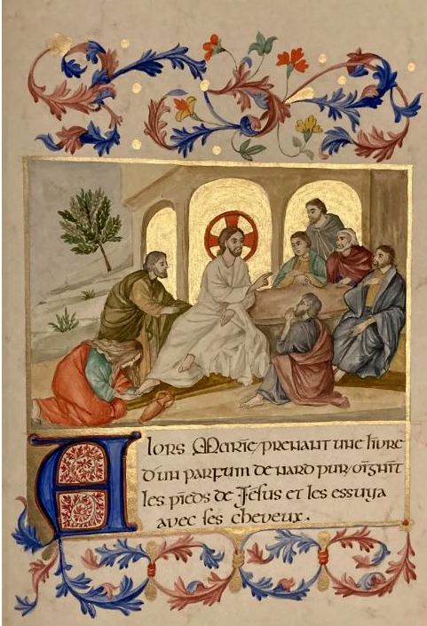 - Anne-Marie Troechslin, miniature, 2000, Bible enluminée, collection privée, Suisse. Originaire de Milan, cette artiste suisse est réputée pour ses aquarelles de fleurs et d’oiseaux. Elle est décédée en 2007, à l’âge de 80 ans. En 2000, pour une abbaye de Zurich, elle a illustré la Bible à la manière des manuscrits enluminés, avec un choix de miniatures pour le temps pascal. Marie est aux pieds de Jésus, qui discute avec Judas, à droite. Possiblement, Marthe est à table à droite de Jésus et Lazare devant, à ses pieds. Des disciples sont présents. L’environnement floral, très délicat, donne une touche joyeuse à cette scène enluminée.