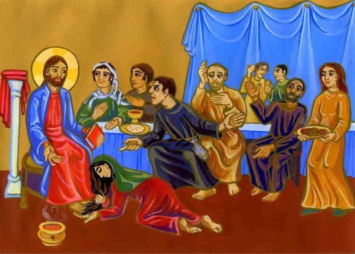 Revenons à Jean. Dans l’imaginaire chrétien, ce geste est souvent attribué à Marie-Madeleine, alors qu’en Jean, il s’agit de Marie de Béthanie, sœur de Marthe et Lazare. Marie de Magdala n’a rien à voir là-dedans! En Jean, c’est une toute autre figure (cf. Marie de Magdala, disciple et apôtre (Jean 20, 11-18). Pourquoi cette attribution dans l’imagerie? Parce qu’elle avait de longs cheveux? Qu’importe. Le sens du geste en Jean, comme en Marc et Matthieu, est lié directement à la mort proche de Jésus, à l’événement de sa mise à mort qui se rapproche. C’est un geste de piété et de reconnaissance, geste de croyante qui voit, qui ressent, ce à quoi les autres sont insensibles.
