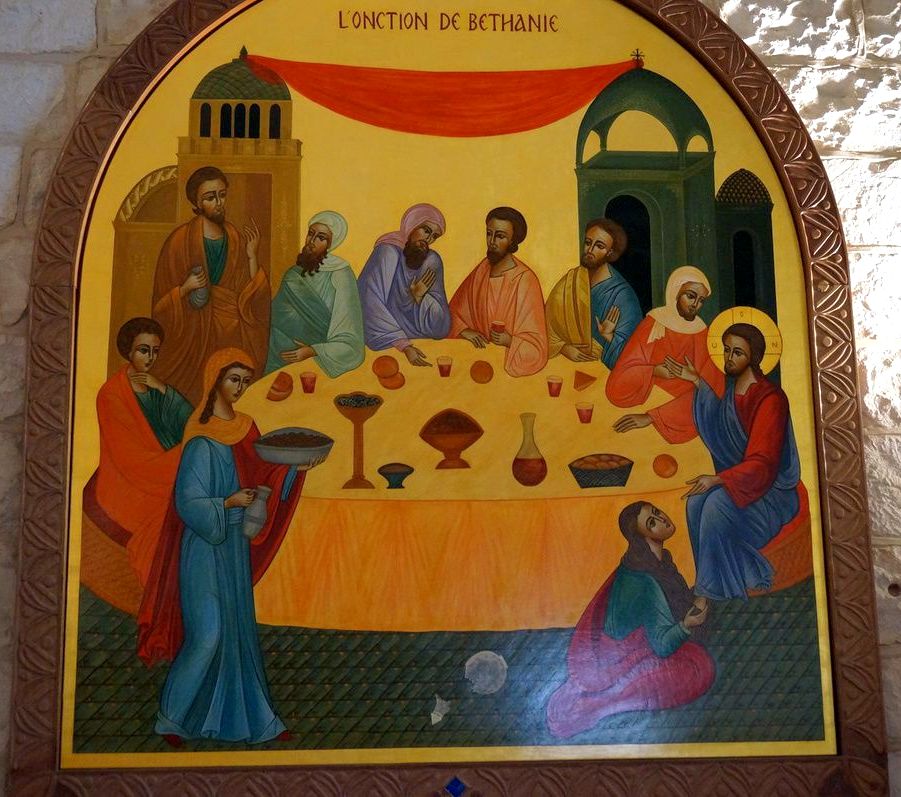 - Sr Marie-Paul, icône, 21e siècle, site bénédictinesmontdesoliviers.org, Israël. Cette grande icône a été écrite par une moniale bénédictine du Mont des Oliviers à Jérusalem. À droite, en bas, Marie répand le parfum sur les pieds de Jésus. À côté de celui-ci, Lazare, tête couverte de blanc. À gauche, Marthe apporte un plat et une cruche. En haut, à gauche, Judas est là, tenant sa bourse d’une main et levant l’autre. Des disciples sont présents et quelques curieux. La tour verte, en haut à droite, symbolise Jérusalem. Pain et vin sont sur la table.