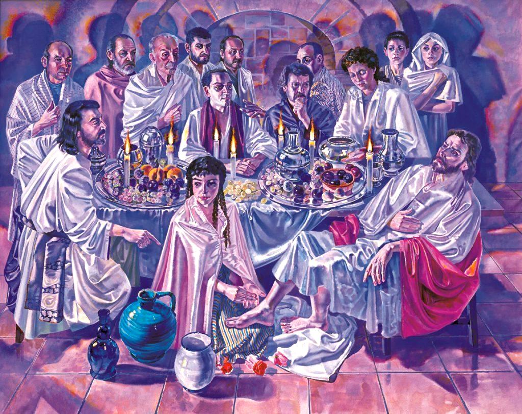 - Juan Cantabrana, 2014, site juancantabrana.com, Espagne. Ce peintre originaire de Cordoba s’inscrit dans le courant de la nouvelle figuration espagnole. Ses paysages et portraits sont marqués par une recherche de lumière et transparence. Il a aussi fait des scènes bibliques. Ici, Marthe, à droite, apporte un plat; Lazare est au centre à la table; Judas, à gauche discute avec Jésus, pointant du doigt le geste de Marie, qui regarde vers la gauche, ouvrant l’image vers un ailleurs. Des disciples sont à l’arrière. La table est chargée de fruits et l’œuvre ressemble à une Cène. C’est d’ailleurs son titre : La Cène de Béthanie.