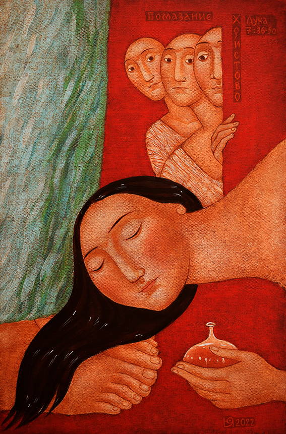 - Julia Stankova, icône, 2022, site juliastankova.com, Bulgarie. Cette artiste bulgare, déjà présente dans ces chroniques, allie la tradition byzantine et une expressivité personnelle. Ici, la figure de Marie, aux long cheveux, tenant le parfum, est recueillie et méditante. Trois témoins sont présents à l’arrière. Je suis peut-être l’un d’eux; je regarde et m’interroge …
