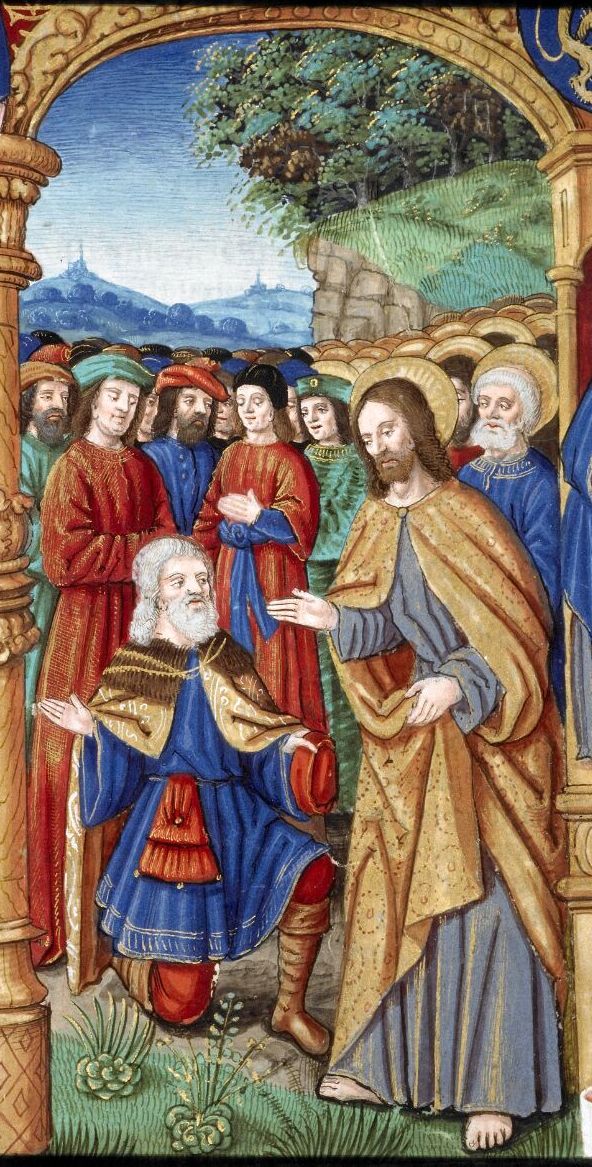 - Miniature, 1506, Grande vie du Christ, f.162, Ms 5125, Bibliothèque municipale de Lyon, France. Écrit par Ludolphe le Saxon, un dominicain allemand entré en 1340 chez les Chartreux, cet ouvrage utilisant les quatre évangiles a eu beaucoup de succès et d’influence. Cette édition enluminée, du début du 16e siècle, est une traduction du latin au français, réalisée pour la duchesse de Lorraine. L’enlumineur, désigné comme le Maitre de Philippe de Gueldre (époux de la duchesse), utilise des couleurs intenses, dont le bleu. Ici, la miniature montre un homme âgé implorant Jésus. Il a plus l’air d’un notable que d’un centurion, mais il pourrait être l’un ou autre. Jésus s’adresse à lui. Plusieurs disciples, nimbés, l’accompagnent, dont Pierre plus visible. Une foule est présente, avec des personnages élégants. À l’arrière, un paysage et des feuillages.