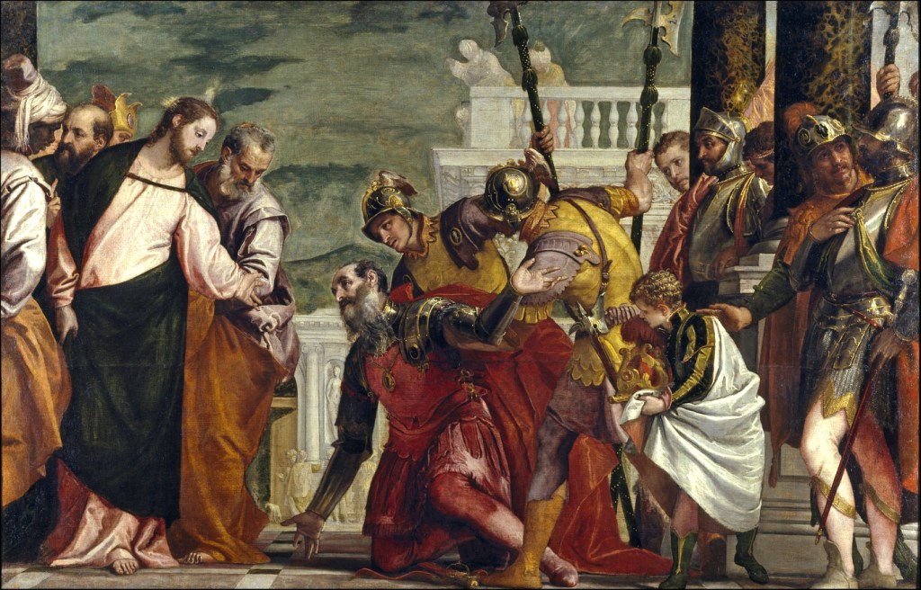 - Paolo Véronèse, c.1571, Musée du Prado, Madrid, Espagne. Le grand peintre vénitien avait la vedette pour le 1er signe à Cana (chronique précédente). Ici, il s’agit du centurion, mais on peut lui faire une place. On retrouve la variété des figures, la splendeur des vêtements, des éléments architecturaux et la vitalité du mouvement d’ensemble.