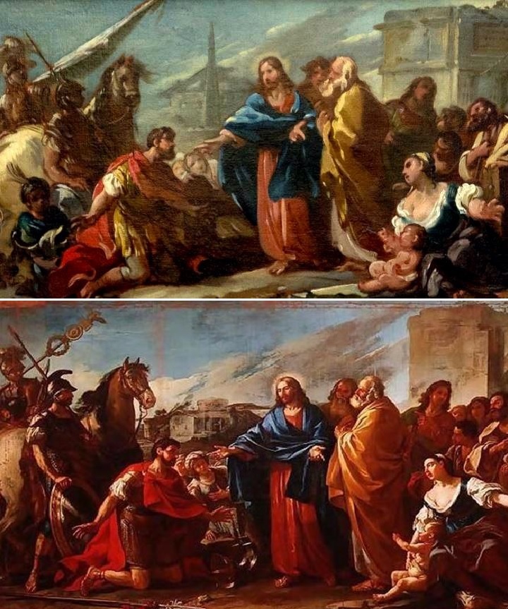 - Joseph-Marie Vien, c.1750-1752, Musée des Beaux-Arts de Brest; 1752, Musée des Beaux-Arts de Marseille, France. Ce peintre de Montpellier, formé à Paris et Rome, a fait des scènes antiques dans un style néo-classique. Il a formé de nombreux artistes. Il fut le dernier peintre officiel du roi de France (Louis XVI) et survécut aux courants politiques successifs. Napoléon le fit même enterrer au Panthéon (le seul artiste). Ici, nous avons d’abord une esquisse qui servira pour un tableau de Marseille, plus bas, avec quelques variantes. L’originalité des deux tableaux est le titre officiel : Guérison du fils du centenier. C’est la synthèse des deux récits! Dans l’esquisse, l’habit de l’homme suppliant Jésus n’est pas évident; un militaire est derrière lui. Mais dans le tableau, il a l’air d’un centurion. On peut, comme jeu, identifier les différences entre les deux œuvres dans les personnages et les décors.