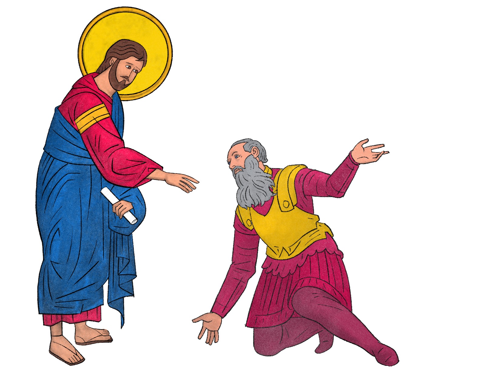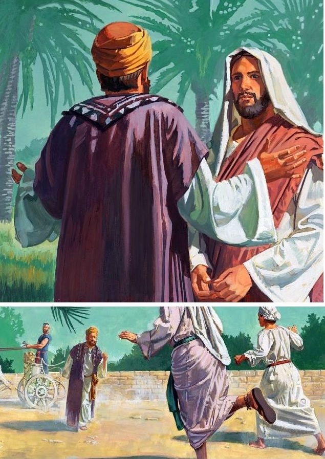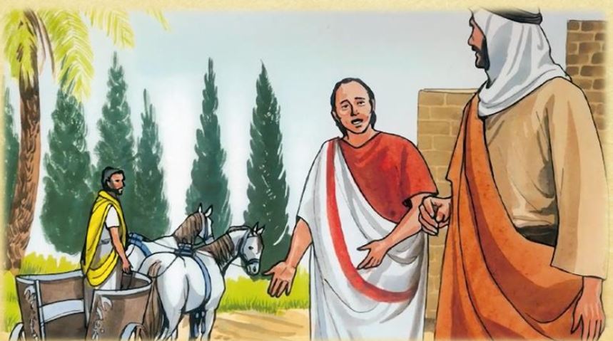 - Robert Theodore Barrett, 20e siècle, site churchofjesuschrist.org, Utah, États-Unis. Cet artiste américain a illustré plusieurs livres religieux. Il est membre de l’Église de Jésus-Christ des Saints-des-Derniers-Jours (Mormons). Père de dix enfants, il a enseigné les arts à l’Université Brigham Young. Ici, nous avons la rencontre entre Jésus et l’officier, vu de dos, qui fait sa demande à Jésus, attentif. Puis, nous avons une scène rarement représentée (Jn 4,51) : le père s’en retourne chez lui et ses serviteurs vont à sa rencontre pour lui annoncer que son fils vit. Une bonne nouvelle se met à circuler.