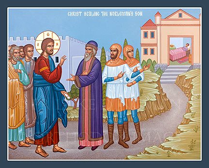 - Icône, Église grecque-orthodoxe, site stparaskevi.org.au, Melbourne, Archidiocèse d’Australie. Cette icône comprend plusieurs éléments. À gauche, Jésus est avec ses disciples, Pierre et Jean en tête; il a un rouleau de la Parole en main. Au fond, la ville de Cana est évoquée par un édifice. Au centre, l’officier royal se tient droit, dignement et bien mis, pour présenter à Jésus sa demande; deux serviteurs l’accompagnent, indiquant de la main la situation. À droite, ce qui est assez unique, le motif de la demande est montré : le fils mourant, dans la grande demeure de Capharnaüm; et la route qui y mène. Mais le fils reprend vie. Et nous, avec lui …