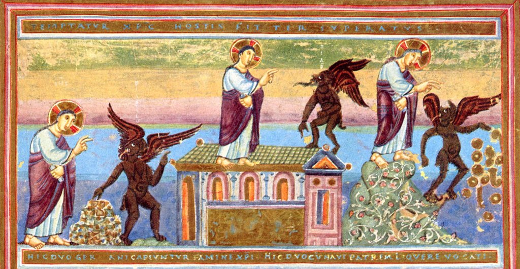 - Miniature, c.1020-1030, Codex Aureus Epternacensis, folio 20, recto, Musée National Germanique, Nuremberg, Allemagne. Ce manuscrit enluminé, écrit avec des lettres d’or, a été réalisé par le scriptorium de l’Abbaye d’Echternach, ville aujourd’hui au Luxembourg. Les tentations suivent l’ordre de Matthieu : le désert avec les pierres, l’édifice du temple, la montagne stylisée. Le Jésus imberbe et nimbé de l’Antiquité rencontre un diable ailé (ange déchu) et laid, qui s’agite. À chaque étape, Jésus a en mains un rouleau de la Parole; cela montre une bonne saisie du texte par l’artiste.