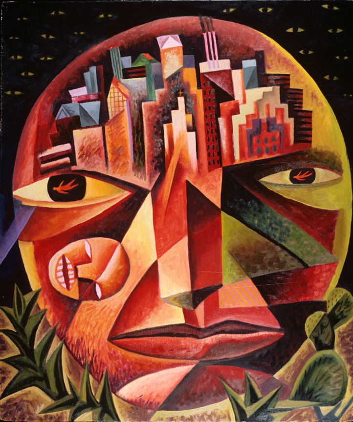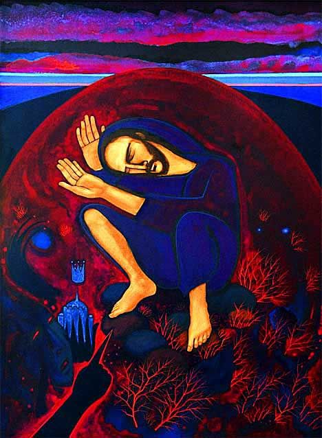 - Michael D. O’Brien, The Art of Michael D. O’Brien, Ignatius Press, San Francisco, 2019. Cet écrivain catholique, qui est originaire d’Ottawa et a vécu à Inuvik, est l’auteur renommé de plusieurs romans et essais. Il est aussi peintre, de style néo-byzantin, et réside à Combermere en Ontario. Nous voyons ici Jésus engagé dans une lutte intérieure. Il est dans une sorte de matrice, en posture de combat et de re-naissance. La figure de l’adversaire est à l’avant à gauche, le doigt comme une arme. Le bleu et le rouge dominent. C’est en notre nom que Jésus livre ce combat. Nous ne sommes pas à l’extérieur de ces images …