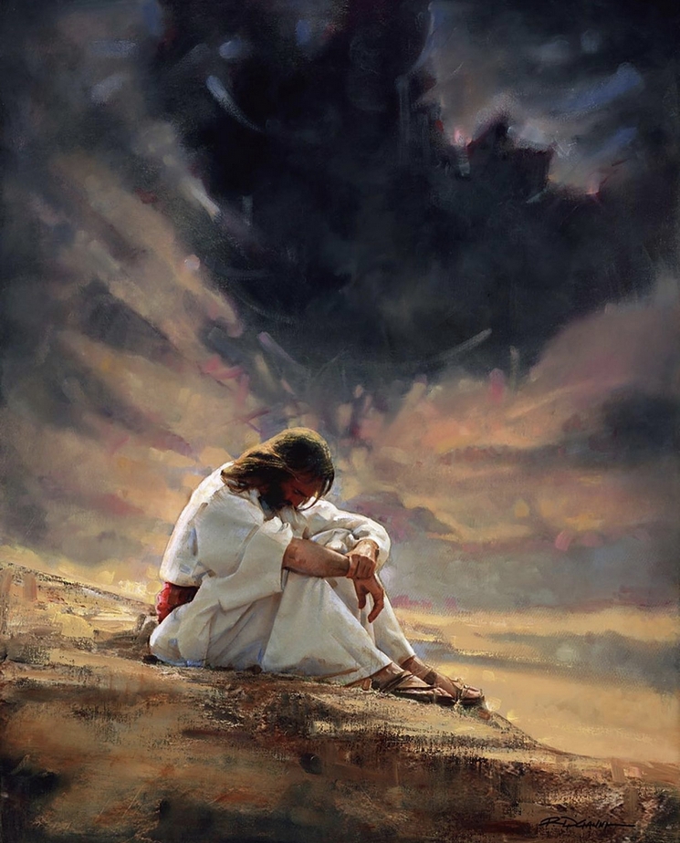 - Ron DiCianni, 2003, site rondicianni.com, États-Unis. Originaire de Chicago, il a travaillé comme illustrateur pour plusieurs compagnies. Il s’est ensuite entièrement consacré à l’annonce de l’évangile par l’art. Voici, au désert, un Jésus concentré et recueilli, qui partage nos quêtes et difficultés. La figure de l’Adversaire est montrée avec force dans le nuage qui le surplombe. Voici l’Ombre maléfique, immense et menaçante.