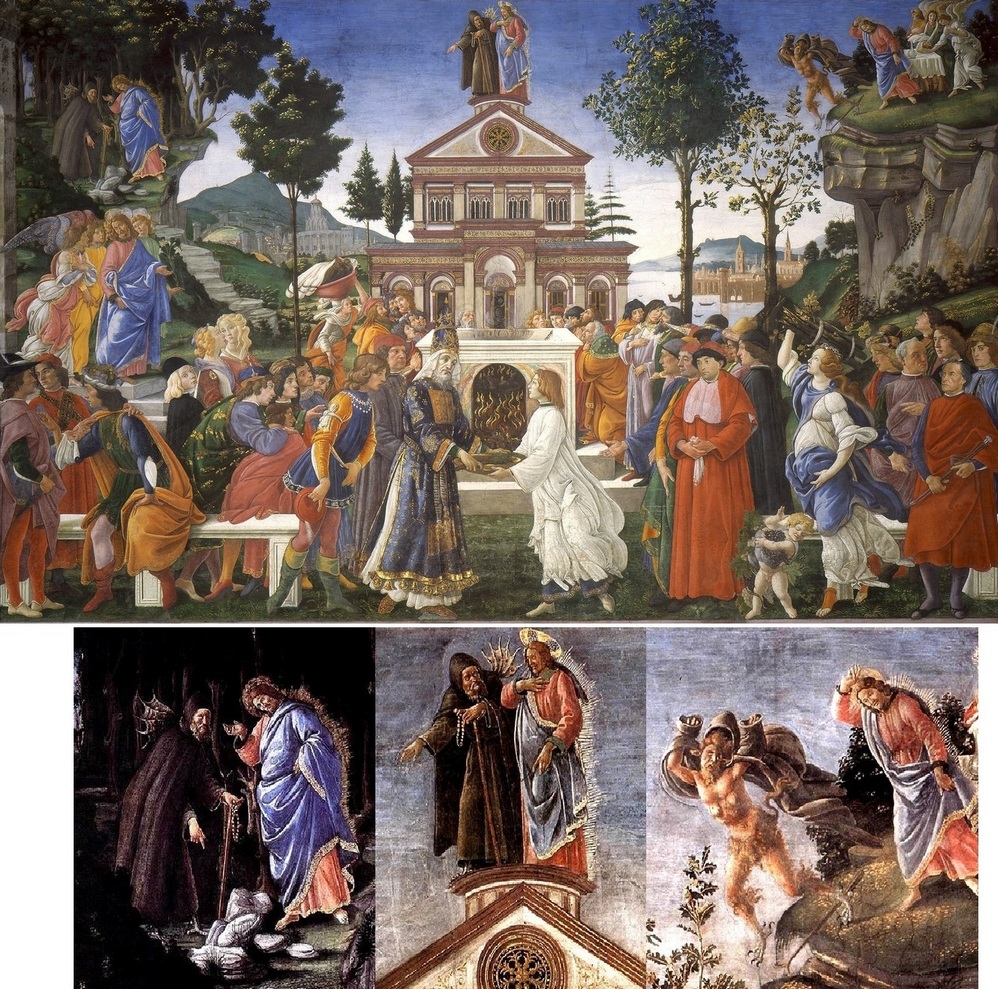 - Sandro Botticelli, 1481-1482, Chapelle Sixtine, Vatican. Ce peintre de Florence, une des figures majeures de la Renaissance, a travaillé avec d’autres artistes aux fresques de la chapelle du pape Sixte IV à Rome, portant sur la vie de Moise et celle du Christ. Cette grande fresque comprend plusieurs personnages et scènes, avec un rituel sacrificiel au centre. Les trois tentations se trouvent en haut. Le diable se présente en ermite, avec un objet de piété, ce qui dit bien l’enjeu religieux des tentations. À gauche, il indique les pierres à Jésus. Au centre, les deux sont au pinacle du temple. À droite, sur la montagne, le diable est démasqué et chassé. Des anges viennent préparer la table eucharistique.