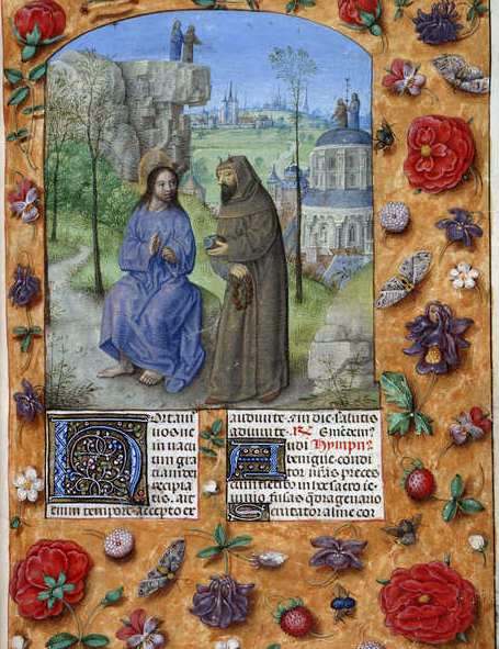 - Miniature, c. 1497, Bréviaire d’Isabelle la Catholique, Ms 18851, British Library, Londres, Angleterre. Ce manuscrit enluminé a été réalisé par des peintres flamands à Bruges. Il a été remis à la reine d’Espagne à l’occasion du mariage de ses deux enfants. Il est considéré comme l’un des trésors de la British Library. Les trois lieux de tentation sont présents : au centre, le désert ; à droite, le temple ; à gauche, la montagne. Le diable, là aussi, est habillé en moine, avec un chapelet. En fond de scène, la ville de Jérusalem. Les contours décoratifs, avec leurs motifs végétaux, sont raffinés.