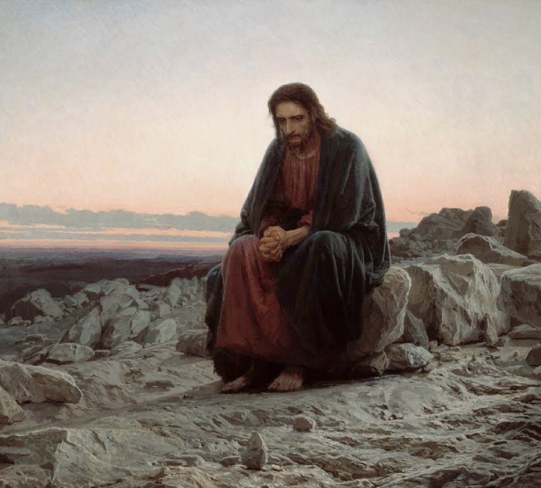 - Yvan Kramskoï, 1872, Galerie Tretyakov, Moscou, Russie. Ce peintre russe de Saint-Pétersbourg fut engagé dans un renouveau de l’art et la lutte pour les droits démocratiques. Il a peint plusieurs portraits et scènes de genre. Ici, c’est un Christ au désert qui est très dépouillé. L’environnement est vaste et rocailleux. Le Christ, assis, est concentré en lui-même, poursuivant son combat intérieur.