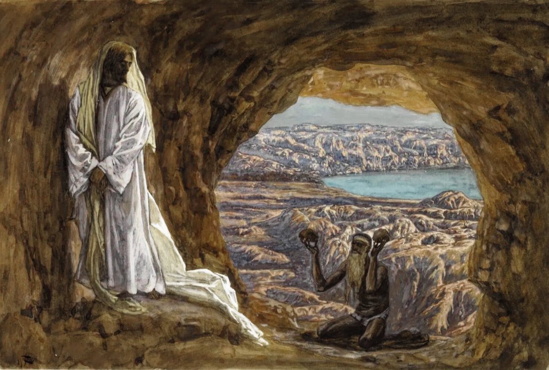 - James Tissot, c.1886-1894, Brooklyn Museum, États-Unis. Cet artiste français, qui a illustré la majorité des scènes des Évangiles, a vécu en Terre sainte et cela peut se voir ici. Le paysage rocheux est celui près de la mer Morte. L’approche de Tissot est originale : Jésus est dans une grotte, à l’écart. La figure du diable est celle d‘un ascète barbu à la peau brûlée, un anachorète du désert qui vit lui aussi dans le jeûne et la prière. Ainsi, la tentation vient du dedans même de l’expérience de Jésus. Agenouillé sur son tapis, le diviseur présente les pierres à transformer en pains. Jésus, tout vêtu de blanc, est recueilli.