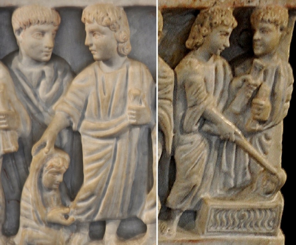 - Sarcophage d’Adelphia, marbre, c.325-350, Musée Archéologique de Syracuse, Sicile, Italie. Des reliefs de scènes bibliques se retrouvent sur les sarcophages et constituent, avec les fresques de maisons chrétiennes et de catacombes, les plus anciennes œuvres d’art chrétien. Ici, dans les deux rencontres, nous avons trois personnages : pour la première, Jésus, la femme et un disciple ; pour l’autre, Jésus, la fille et son père. L’espace ne permet pas de mettre tout le monde ! La femme touche le vêtement de Jésus et celui-ci lui touche la tête. La fille est alitée et Jésus lui redonne vie à l’aide d’un bâton, signe de son autorité. Dans les deux scènes, Jésus, jeune homme imberbe, tient dans la main gauche un rouleau de la Parole.