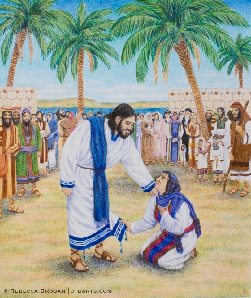 - Rebecca Brogan, 21e siècle, site jtbarts.com, Australie. Originaire de Minneapolis, cette artiste et photographe, vivant en Australie, se présente comme une chrétienne mais sans affiliation. Ici, ce qui est rare dans les images mais mentionné dans le texte de Marc, on est au bord de la mer! La foule est nombreuse et concentrée sur Jésus et la femme, tous deux en bleu, proches par le toucher et le regard. Les gens sont souriants, joyeux, ce qui est aussi rare. Peut-être est-ce l’air de la mer.