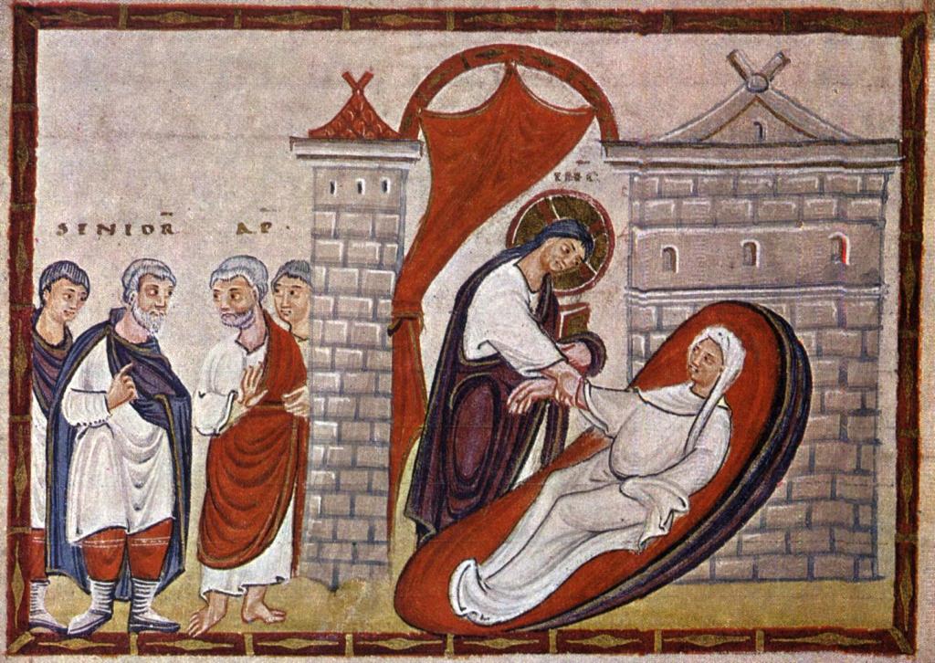 - Miniature, c.980, Codex Egberti, folio 25, Bibliothèque municipale de Trèves, Allemagne. Ce manuscrit a été réalisé par des moines de l’abbaye bénédictine de Reichenau pour l’archevêque de Trèves, Egbert. À gauche, on voit Jaïre, chef de synagogue, avec un compagnon, tous deux bien vêtus et chaussés, et deux disciples, Pierre et Jean. Jésus, de style antique, ayant en main gauche un livre, tient la fille de Jaïre par le bras droit, la tirant vers la vie. Celle-ci est dans un lit qui ressemble à un cercueil. Les deux se regardent avec intensité. L’habitat est une maison de pierre, au rideau ouvert.