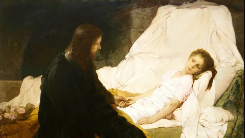 - Gabriel von Max, 1878, Musée des Beaux-Arts, Montréal, Canada. Cet artiste autrichien, formé à Prague et Vienne, s’est intéressé à l’anthropologie et au mysticisme. Seuls sont présents Jésus et la fille, de façon contrastée, avec le blanc et le noir, mais en proximité. La fille semble dormir ; Jésus lui tient la main. À gauche, sur le lit, des fleurs. Cette œuvre est travaillée mais dépouillée dans ce qu’elle contient. Il en émane un certain recueillement, une douceur.