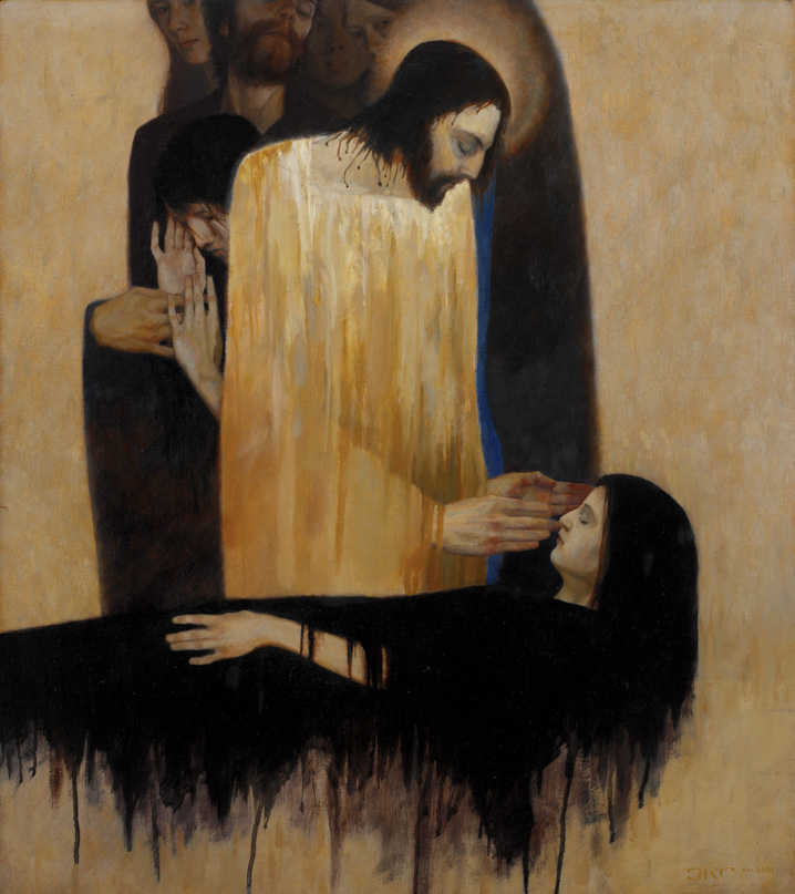 - Joel Kirk Richards, 2000, Springville Museum of Art, Utah, États-Unis. Cet artiste du Utah, membre de l’Église de Jésus-Christ des Saints-des-Derniers-Jours (Mormons), a réalisé des œuvres bibliques qui ont un style très personnel et saisissant (cf. chronique sur une équipe porteuse). On voit ici Jésus et la jeune fille, en contraste de blanc et noir; une ligne bleue suit Jésus. À l’arrière, quatre figures sont témoins de la scène. Les mains ressortent avec force.