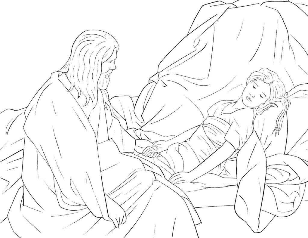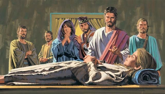 La rencontre avec la fille a lieu dans la maison de Jaïre. En Marc, comme en Luc, Jésus est accompagné de trois disciples, Pierre, Jacques et Jean, les mêmes qu’à la transfiguration (9,2) et à Gethsémani (14,33). Les parents sont présents et Jésus met dehors les pleureurs. En Mathieu (9,23-25), Jésus est seul. Avec tous ces personnages, il y a du jeu dans les images, selon le moment choisi ou l’angle de vision. La jeune fille, qui a douze ans, a parfois plutôt l’air d’une jeune femme ou d’une enfant. Jésus lui tient la main. Le décor, là aussi, peut être plus ou moins élaboré : lit et meubles, draps et vêtements, fenêtre et éclairage.