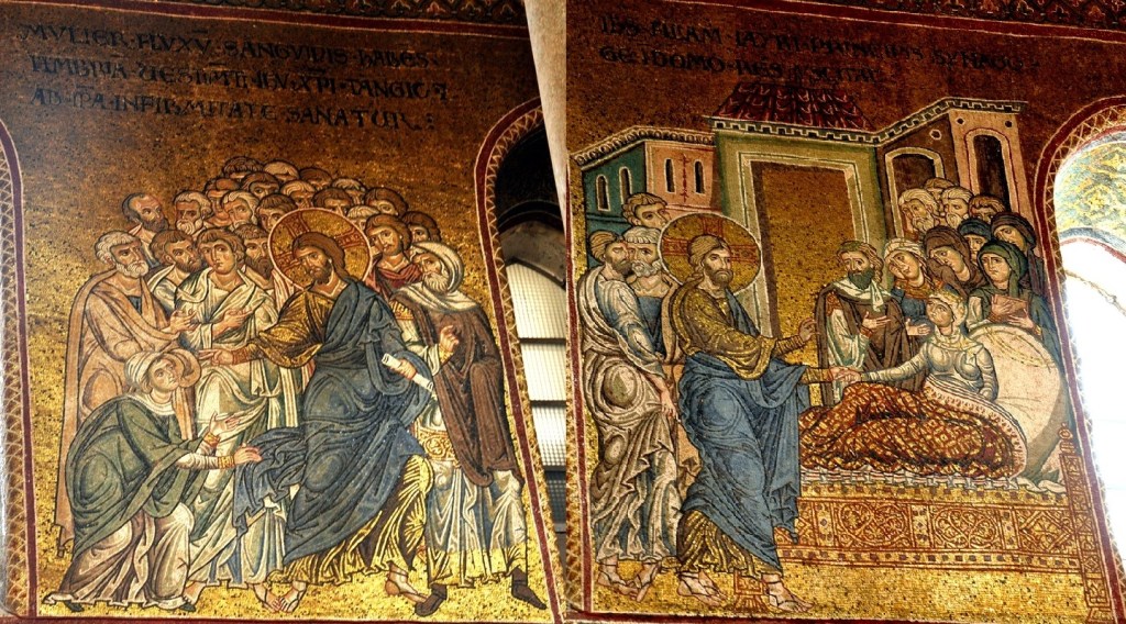 - Mosaïque, 1179-1182, Cathédrale de Monreale, Sicile, Italie. Cette église est remplie de mosaïques de style byzantin, dont un cycle de la vie du Christ, incluant nos deux rencontres. Dans la première, les disciples et la foule sont présents. La femme, courbée, touche le vêtement de Jésus qui se tourne vers elle et la bénit. Jésus, nimbé et solennel, tient en main gauche un rouleau de la Parole. Dans l’autre, les trois disciples sont présents, ainsi que les parents et plusieurs proches et pleureurs. De sa main gauche, Jésus touche la main de la fille, que son père Jaïre désigne de la main. Jésus la bénit de la main droite et l’invite à s’éveiller. Elle sort de son sommeil et se soulève de son lit. La maison est bien montrée ; le lit et la couverture sont finement travaillées. Dans les deux scènes, un contact du regard, entre Jésus et la personne guérie, est établi.