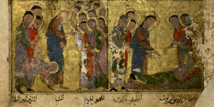 - Miniatures, 1249-1250, Évangéliaire copte-arabe, folio 5, Bibliothèque de l’Institut catholique de Paris, France. Ce manuscrit d’Égypte a été copié par le moine Gabriel, qui deviendra patriarche d’Alexandrie (1268-1271). Les quatre évangiles sont écrits en caractères coptes et les commentaires en caractères arabes. Les enluminures, avec un fond doré, sont influencées par l’art islamique. Dans chacune des deux scènes, à gauche, on voit Jésus, tenant en main un rouleau de la Parole, et trois disciples; à droite, une foule, puis dans l’autre, les parents. La femme est courbée pour toucher le vêtement; la fille est étendue sur un lit. Il n’y a pas de décor. Étrangement, tous sont nimbés.